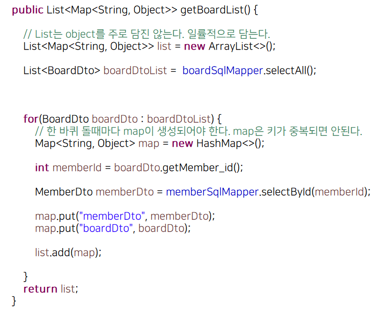 각각의 게시글을 작성한 회원의 정보와 게시글에 대한 정보를 map에 담고, 이 하나의 map에 대한 정보를 여러 개를 담을,