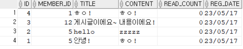 출력 화면을 보면 게시글을 작성한 회원의 ID가 보일 뿐 회원의 닉네임은 알 수 없다는 것을 인지하자.