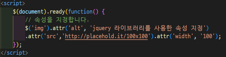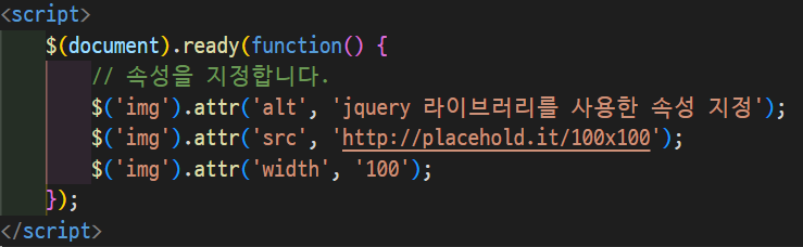 $('img').attr('alt', 'jquery 라이브러리를 사용한 속성 지정');